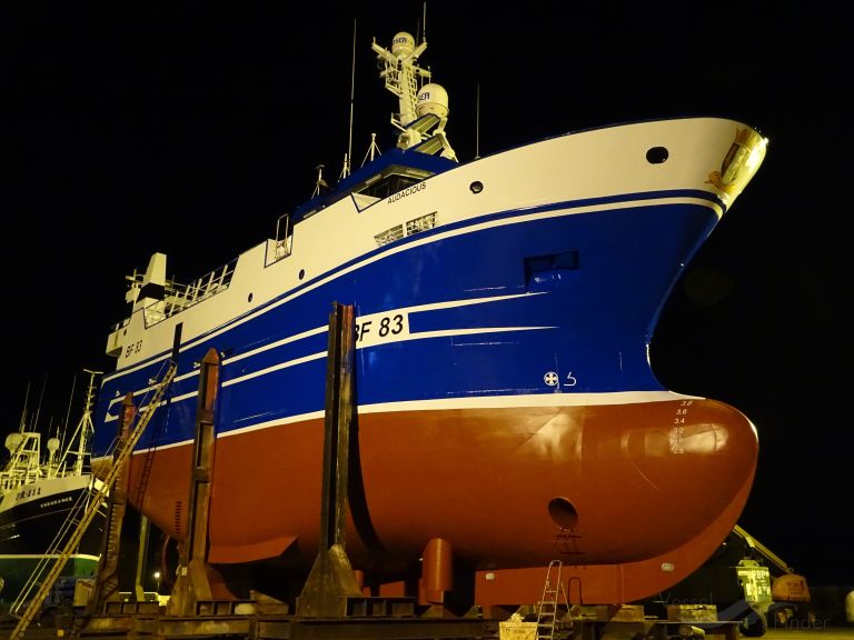 Vessel AUDACIOUS BF83 is a Fishing Registered in United Kingdom. Skippers David Gatt and Barry Reid and the crew quickly started to confirm the capabilities of the versatile new 278m whitefish boat Audacious BF 83 by landing 2000 boxes of whitefish at Peterhead from back-to-back pair-seining trips in just over.